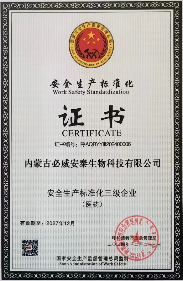 內蒙古必威安泰生物科技有限公司成立于2008年6月,位于呼和浩特市和林格爾乳業開發區,占地123畝,注冊資本1.25億元。公司專注于生物疫苗研發生產,是原農業部批準的首家采用細胞懸浮培養技術生產口蹄疫疫苗的企業,擁有兩條7550升德國進口懸浮培養生產線,年產能20億毫升,覆蓋多種動物疫苗。公司被認定為自治區“企業研發中心"“重點龍頭企業單位”“企業技術中心"和國家"高新技術企業”,“口蹄疫基因標記疫苗”獲全國商業科技進步一等獎。2024年,瑞普生物控股后,公司構建全生命周期質量管控體系,獲多項國際權威認證,包括ISO9001、ISO14001、ISO45001、ISO5001及獸藥GMP、CNAS、GCP、GSP等。